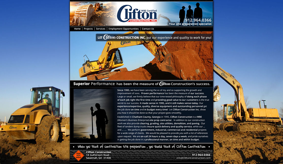 Clifton Construction's CEO, Gina Mincey told InterWeb Designs that she wanted the in-process update to her site to achieve a "wow factor". Previously, the site was a graphically plain brochure type site. In collaboration with our on-staff graphic artist, concepts were generated, and optimized, resulting in the site above. Gina's staff and customers were enthusiastic about the new site. In addition to general information about Clifton Construction, the website also includes a portfolio of projects with construction images, supported by a description of the project and Clifton Construction's role in it's completion. The site also includes an employment application which can be filled out on line, and with a click of the button, emailed as a PDF to the Clifton Construction's offices.